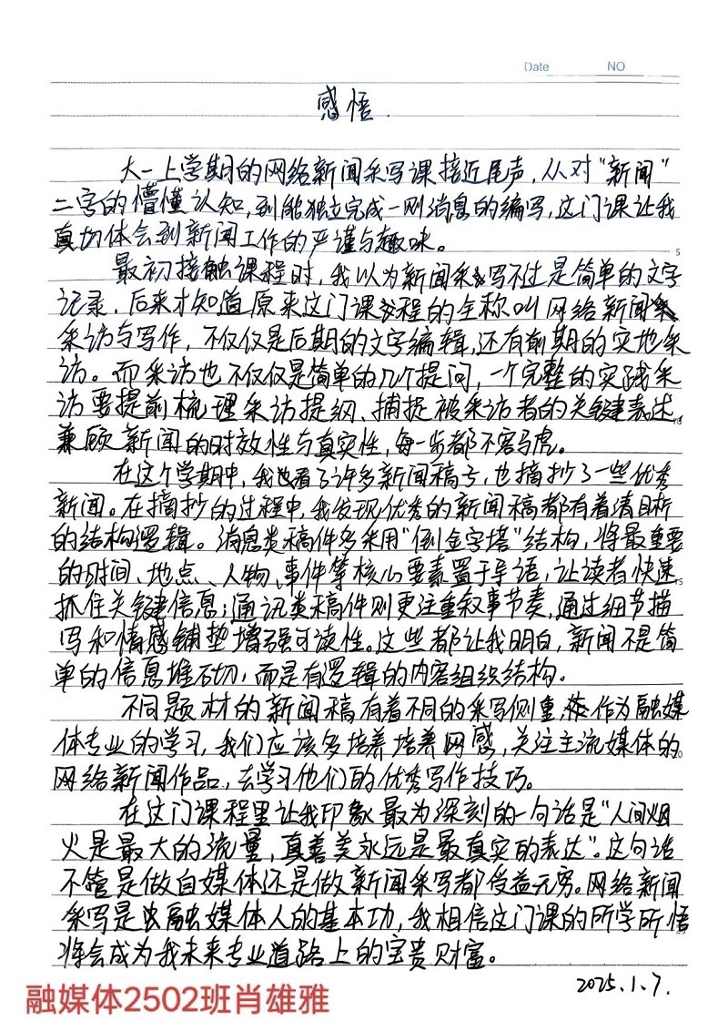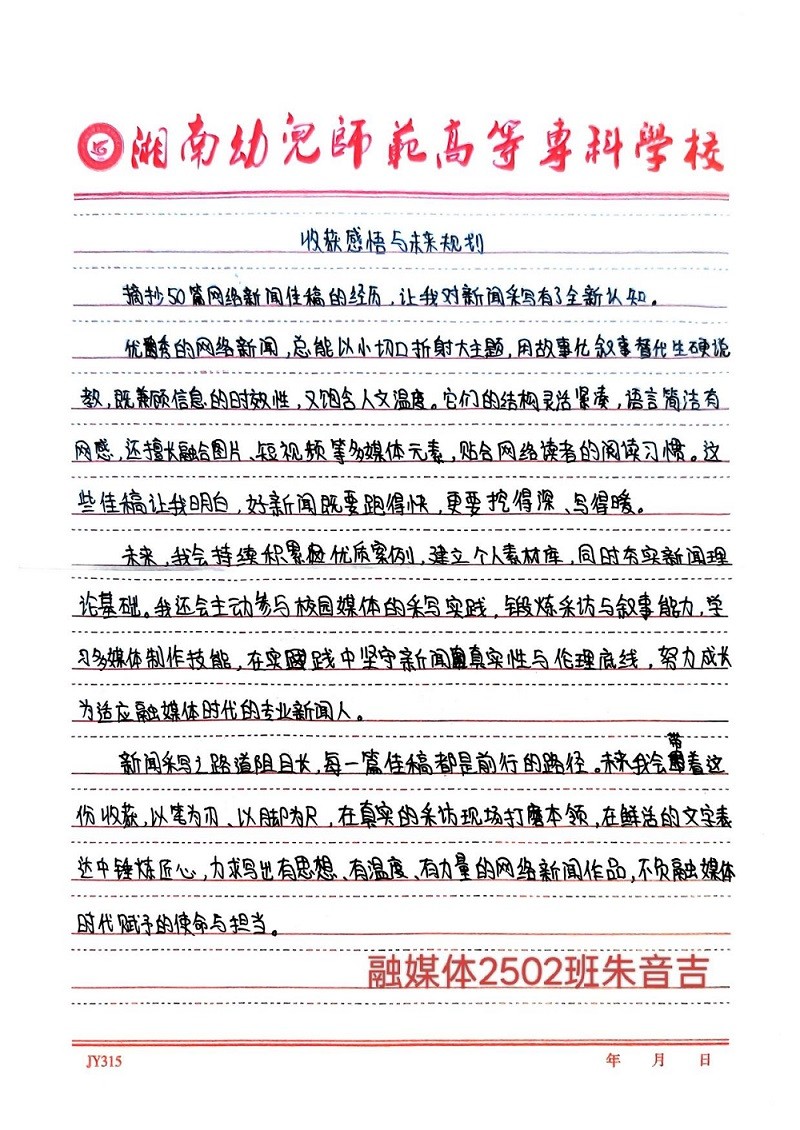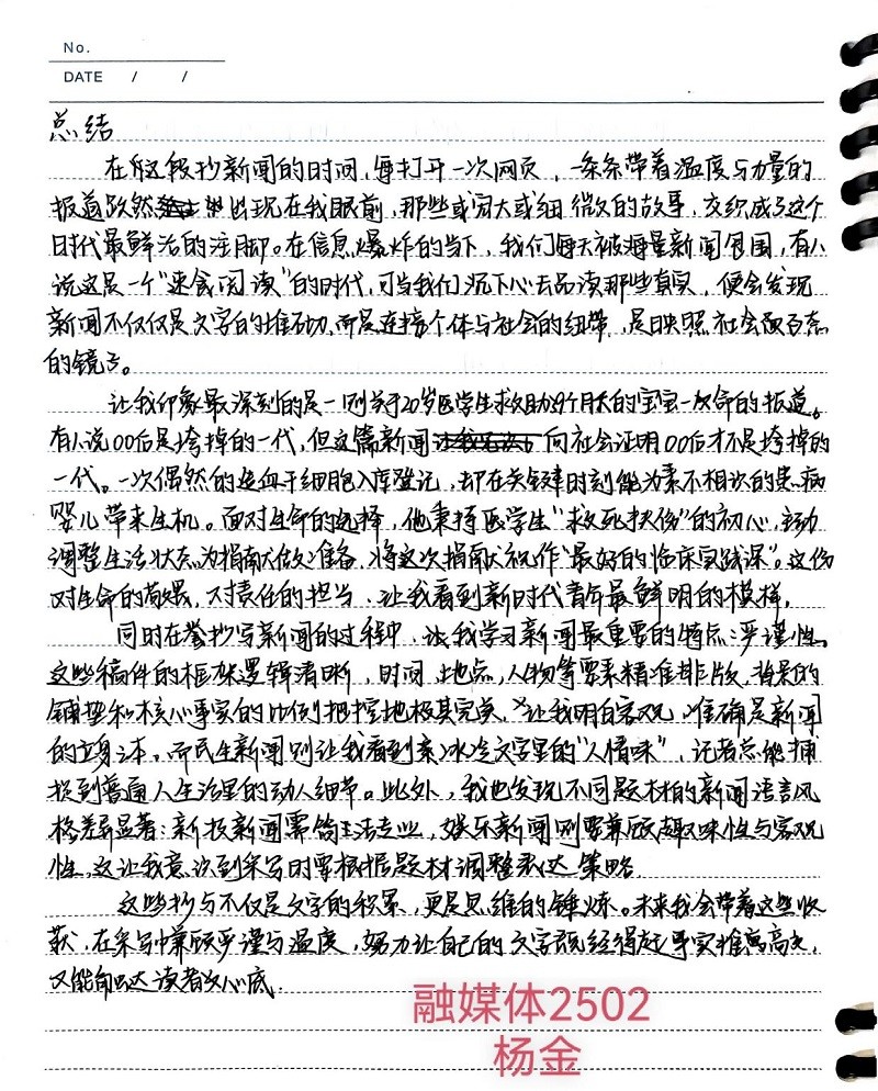 笔尖划过的每一个字,都是对专业的敬畏;墨香沉淀的每一份感悟,都是对未来的期许。融媒体2502班的同学们,在新闻摘抄中褪去青涩,在专业浸润中坚定方向。未来,他们将带着这份初心与匠心,以笔为刃,以脚为尺,在真实的采访现场打磨本领,在鲜活的文字表达中锤炼匠心,努力成长为适应融媒体时代的专业新闻人,不负时代赋予的使命与担当。(供稿:朱勤 审核:罗名清)