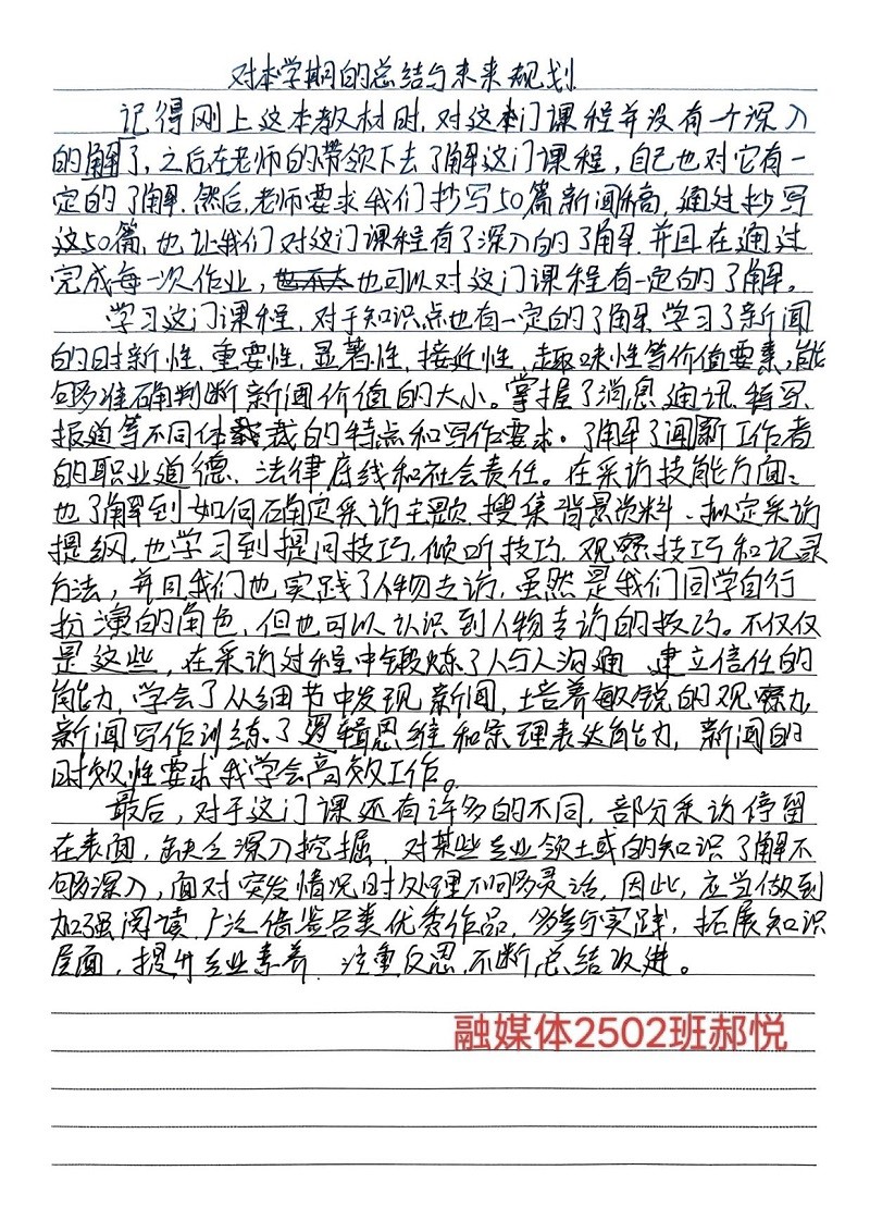 胡玉婷清晰地认识到,新闻采写离不开脚力、眼力与笔力:“扎根现场才能抓来鲜活素材,从繁杂信息里选重点、挖深意,用简洁准确的文字讲好故事——这是融媒体人的基本功。”陈慧玲则为自己制定了清晰的后续计划:主动参与校园新闻采编、争取校外媒体实习机会,学习新闻摄影与短视频剪辑,建立个人素材库,不断丰富专业储备。