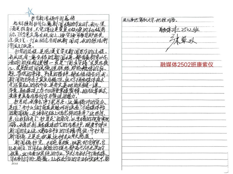 在拆解优秀稿件的过程中,同学们逐渐读懂了新闻的“骨架”与“灵魂”。谢宣灿发现,“倒金字塔结构几乎贯穿大多数稿件——把最重要的时间、地点、人物、事件放在导语,能让读者在最短时间内抓住核心”;肖雄雅则注意到,消息重逻辑,通讯重叙事,“新闻不是信息的简单堆砌,而是有逻辑的内容组织”。黄娟琪将收获凝练为三点:夯实语言功底、熟悉稿件结构、强化职业素养。她认为,“抄写过程中对数字、人名、地名等关键信息的反复核对,正是新闻人严谨细致、求真务实的基本功。”
