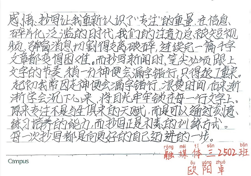 在信息碎片化奔涌的时代,当注意力被短视频与弹窗切割成断点,艺术设计学院融媒体2502班的同学们选择沉下心来,在一笔一画的新闻摘抄中,与时代对话。五十篇稿件的抄录,起初被视为机械任务,如今却成为他们眼中的“专业必修课”。这不仅是一次文字的复刻,更是一场关于新闻理想、专业素养与时代认知的深度浸润