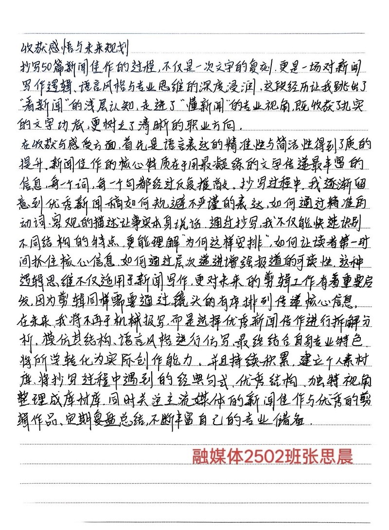 摘抄的意义,不止于当下的学习,更在于为未来的专业之路筑基。刘莹说,摘抄让她跳出“刷新闻”的浅层认知,走进“懂新闻”的专业视角,“在思考‘这篇报道为何能打动人’‘选题切入点有何独特之处’的过程中,我逐渐理解了融媒体时代的新闻创作,既要守住真实客观的底线,也要兼具传播力与感染力。”张思晨则将摘抄与未来的剪辑工作相联结:“新闻写作的逻辑思维,同样适用于镜头语言的有序排列。未来我会拆解优秀作品,模仿其结构与风格,最终转化为自己的创作能力。”