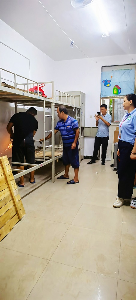急学生所急,部门联动快速响应。学生工作处在获悉该情况后,第一时间与后勤保障处取得联系,共商解决方案。本着“以生为本”的原则,两部门迅速达成一致:绝不能让学生“缩着腿”睡觉。经过现场勘查和可行性论证,一个简单又实用的方案被提出并立即执行--将两张相邻的床铺进行改造。