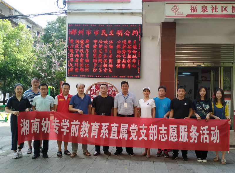 8月21日,湘南幼专学前教育系直属党支部联合福泉社区党支部开展党员志愿服务活动,组织部分专业教师党员以及入党积极分子来到社区街道开展清洁家园大扫除活动。党委书记雷春国同志以普通党员的身份参与了此次活动。