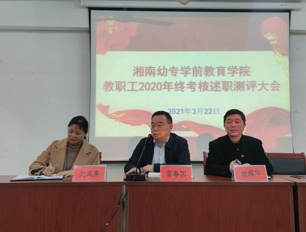 3月23日19时至22时,学前教育学院教职工2020年终考核述职测评大会在四栋一楼报告厅顺利召开。党委书记雷春国出席大会并讲话,院领导刘凤英、谢耀华、冷佩坤、周知胜及全院教职工参加。大会由院长刘凤英主持。