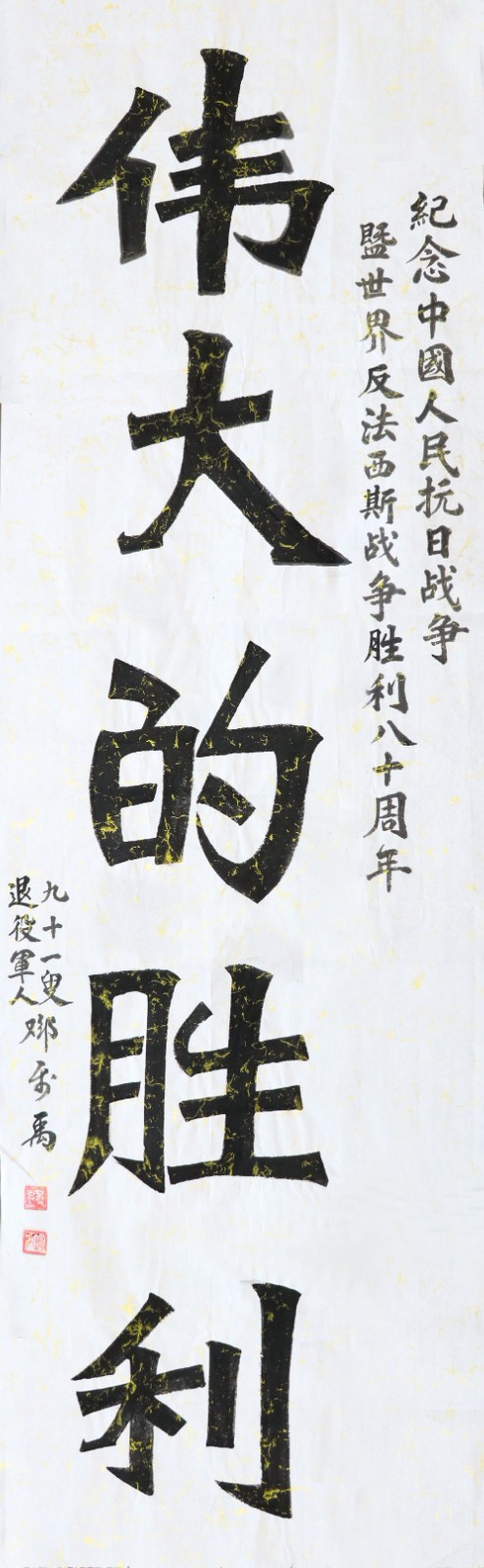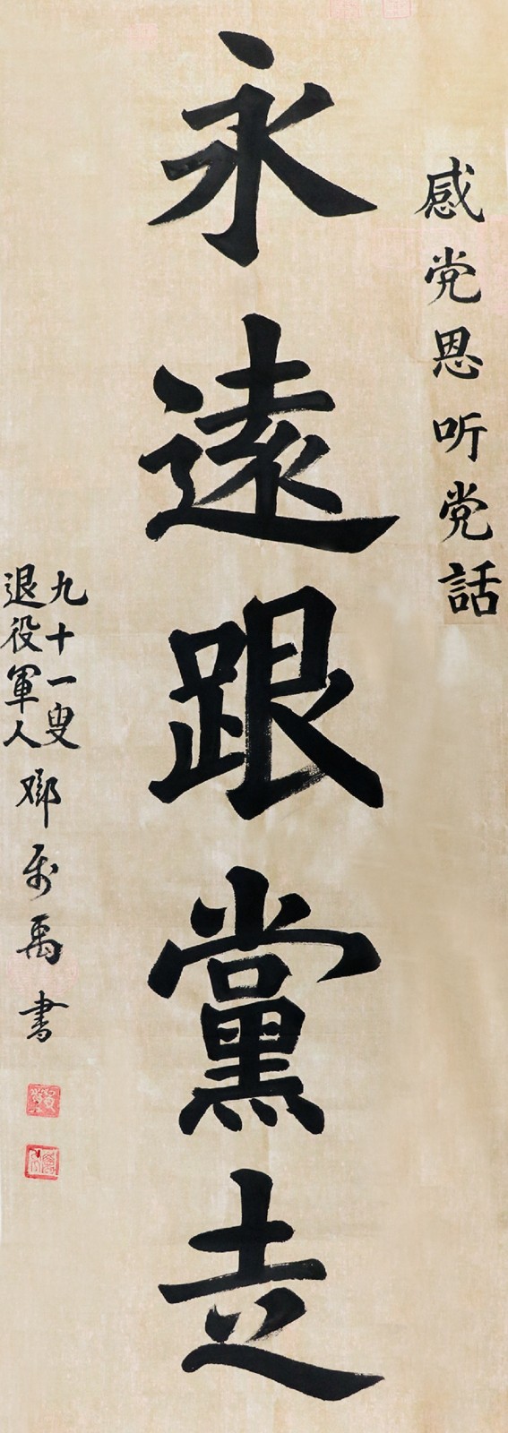 三幅作品,大字挺拔,让人领略到91岁老人的风采和气骨——正楷书写的“永远跟党走”,用笔考究,法式严谨,刚劲有力,诉说着老兵邓属禹退休不褪色、坚定信念跟党走的信念;“山河不屈”“伟大的胜利”,撇捺间尽现魏碑体的厚重雄健、规则中正,寄托着老兵邓属禹珍爱和平、希望祖国早日实现完全统一的愿望。
